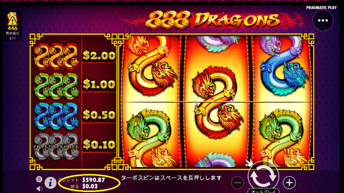 例えばPragmaticPlayの『888dragons』というゲームを見てみると、何と0.02ドルという金額からプレイできます。