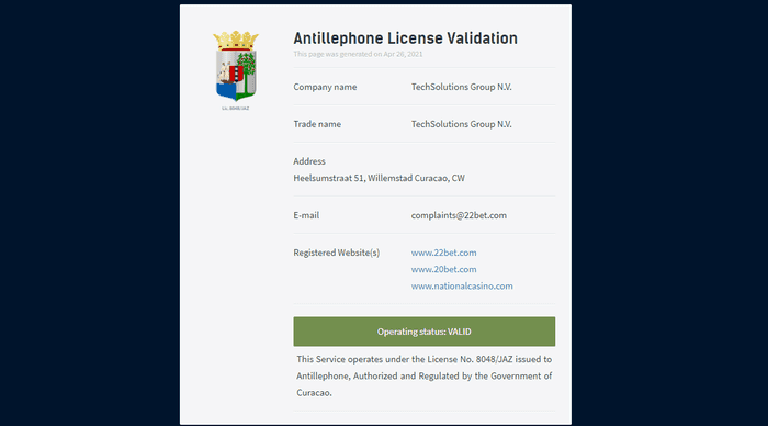 22betはTechSolutions Group N.V.というオランダ領キュラソー島に本拠を置く会社が運営しています。