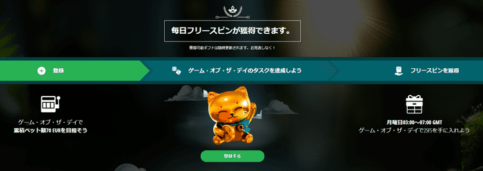 「ゲーム・オブ・ザ・デイ」では、曜日ごとに定められたミッションをクリアすることで、所定の回数分フリースピンを受け取ることができます。