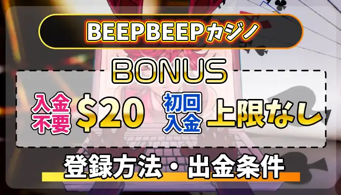 【20ドル】BEEPBEEPカジノの入金不要ボーナスの貰い方・登録方法・出金条件を解説