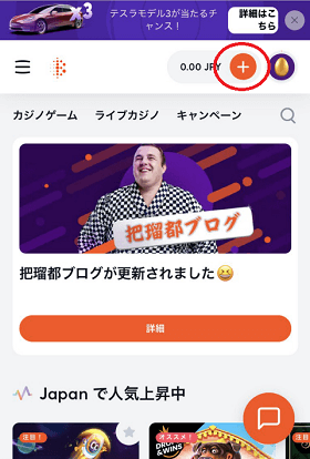 ビットカジノにログインできたら、まずは画面右上に見られる「+」のアイコンをタップします。