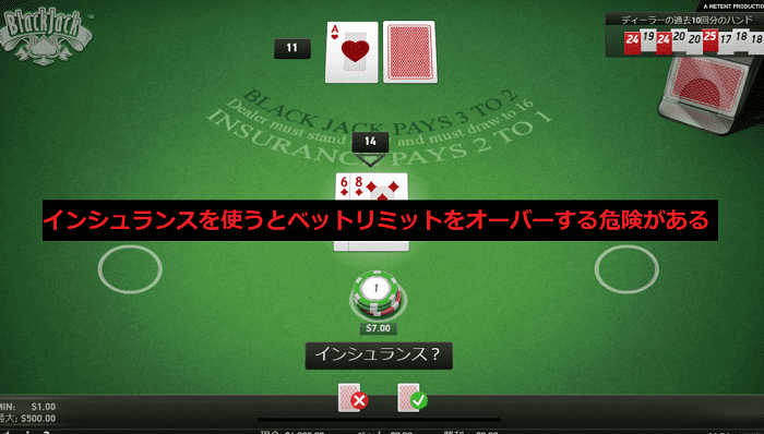 しかしインシュランスやダブルアップ、スプリットなどのアクションを使うと、ベットリミットを超えてしまう可能性があります。