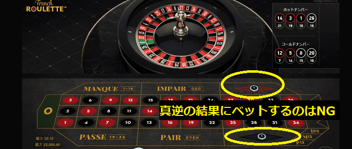 例えばルーレットで赤と黒に同時に賭けるようなベットが一例です。