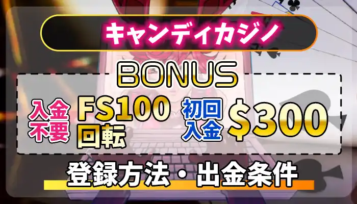 キャンディカジノでは新規登録でフリースピン100回の入金不要ボーナスが貰えます。キャンディカジノの入金不要ボーナス詳細情報を下記にまとめました。