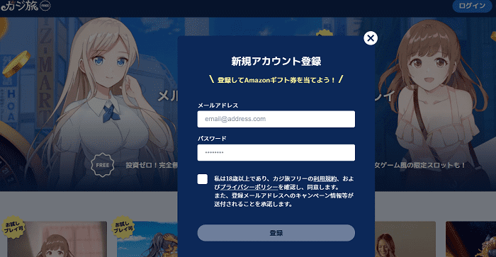 基本的にカジ旅フリーのゲームをプレイするためにはアカウント登録が必要です。