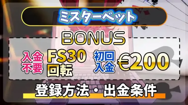 ミスターベット 【限定FS30回】ミスターベットの入金不要ボーナス付き登録方法・出金条件・初回入金ボーナス情報を解説! 2023年11月8日 setup001 オンカジギャンブラーの酒場|オンラインカジノ最強攻略サイト