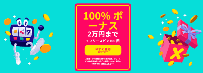 具体的なボーナス内容は最大2万円の100%ボーナス、そしてフリースピン100回分という内容です。