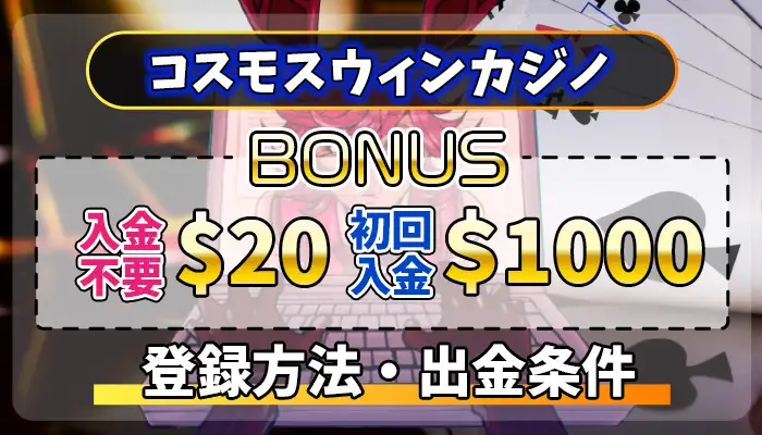 コスモスウィンカジノ(コスモスwin)の入金不要ボーナスの貰い方を解説します。当サイトから新規登録で、20ドルの入金不要ボーナスが受け取れます。当サイト限定の特別プロモーションなのでぜひご活用ください。