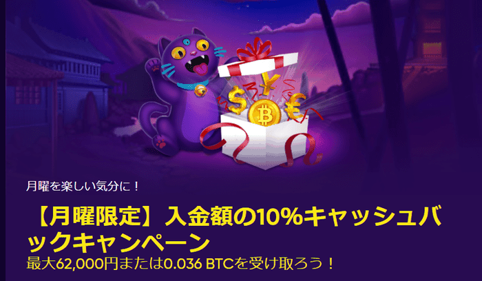 具体的には月曜日の入金額の10%が最大6万2000円まで、翌日火曜日にキャッシュバックされるという内容です。