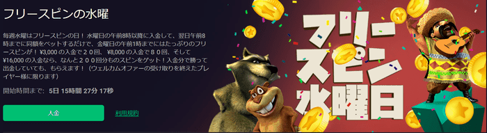 ビットスターズでは水曜日に入金し、さらに入金額と同額以上をベットすると入金額に応じてフリースピンを獲得できます。