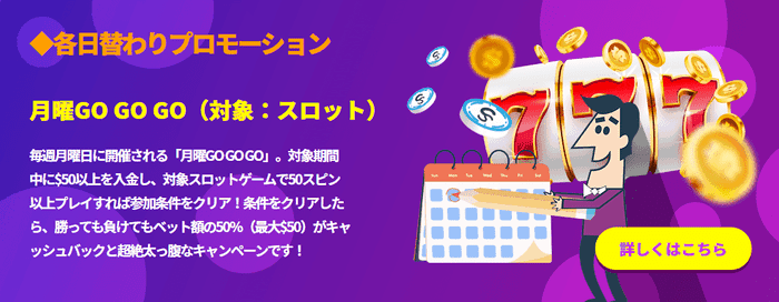 月曜日に50ドル以上を入金して、対象機種で50スピン以上をプレイすることで出金条件1倍のボーナスを受け取ることができます。