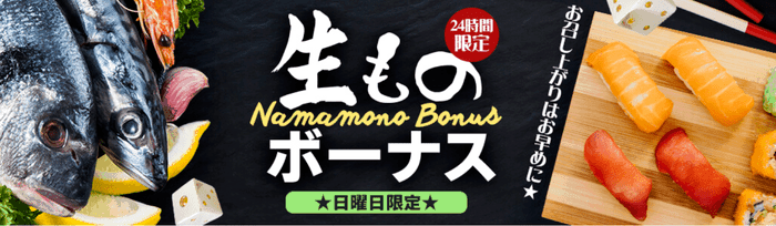 ジパングカジノでは毎週日曜日に「生ものボーナス」という入金ボーナスが用意されています。ボーナス内容はその時々によりけりです。