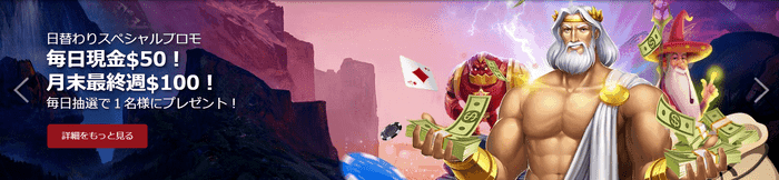 最大で50ドル分の賞金を獲得可能です。賞金はボーナスではなくキャッシュの形で進呈されるため、出金条件は付帯しません。