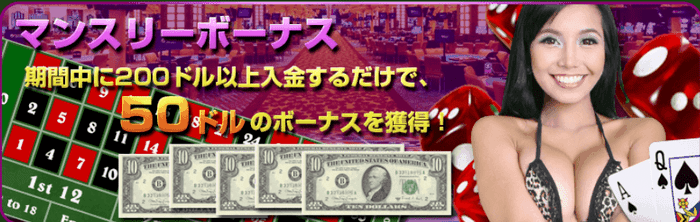 ワイルドジャングルカジノでは毎月1日から14日までに200ドル以上を入金すると、15日に50ドルのボーナスが進呈されます。出金条件は5倍とかなりお得です。