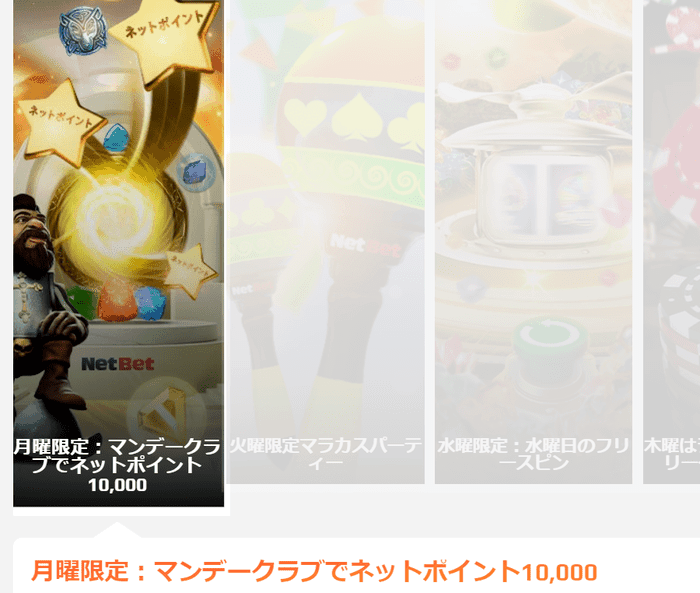 曜日ごとに内容が異なるボーナスを提供しているNetBetでは、月曜日にボーナスコード「NPMONDAY」を入力して入金することで、ネットポイントを1万ポイント獲得できます。