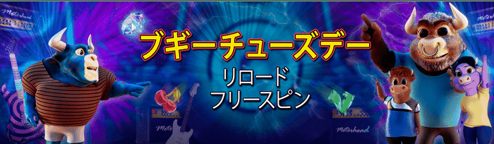 火曜日は「ブギ―チューズデー」の対象で、入金によりボーナスやフリースピンを獲得可能です。具体的なボーナス内容は以下の通りとなります。