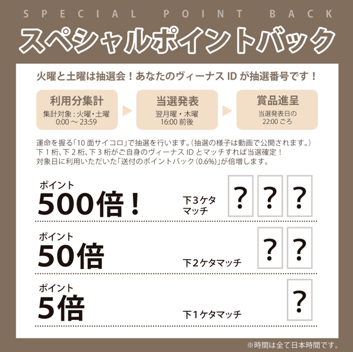 火曜日にヴィーナスポイントを利用したユーザーは、抽選により通常よりもお得なレートでポイントバックを受けられる可能性があります。
