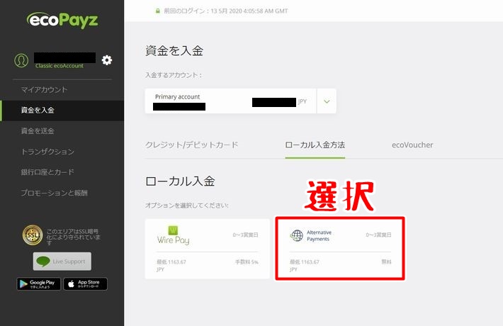 銀行振込や仮想通貨で入金する場合には「ローカル入金方法」をクリックしてください。
