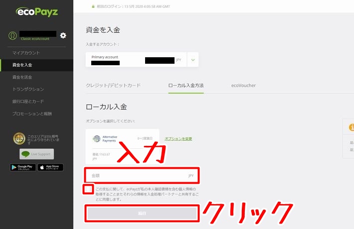 「Alternative Payments」を選択したら入金したい金額を入力し、個人情報を共有する旨のチェックボックスにチェックを入れて「続行」ボタンをクリックします。