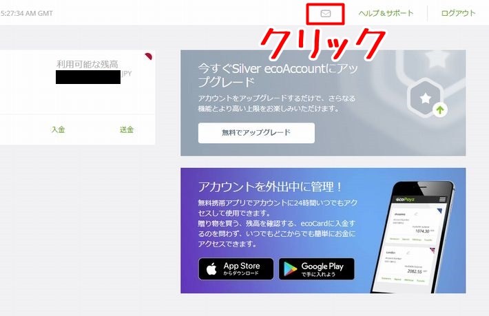エコペイズのカスタマーサポートに問い合わせをするときは、まずアカウント管理画面の右上にある「メール」アイコンをクリックします。