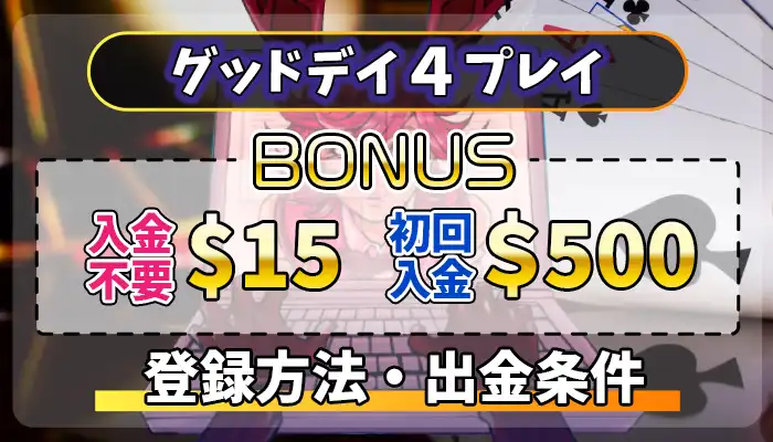 グッドデイフォープレイ(GOOD DAY 4 PLAY)で入金不要ボーナスを貰う手順や登録方法、出金条件を解説します。今なら当サイトからグッドデイフォープレイに新規登録すると15ドルの入金不要ボーナスが貰えます。