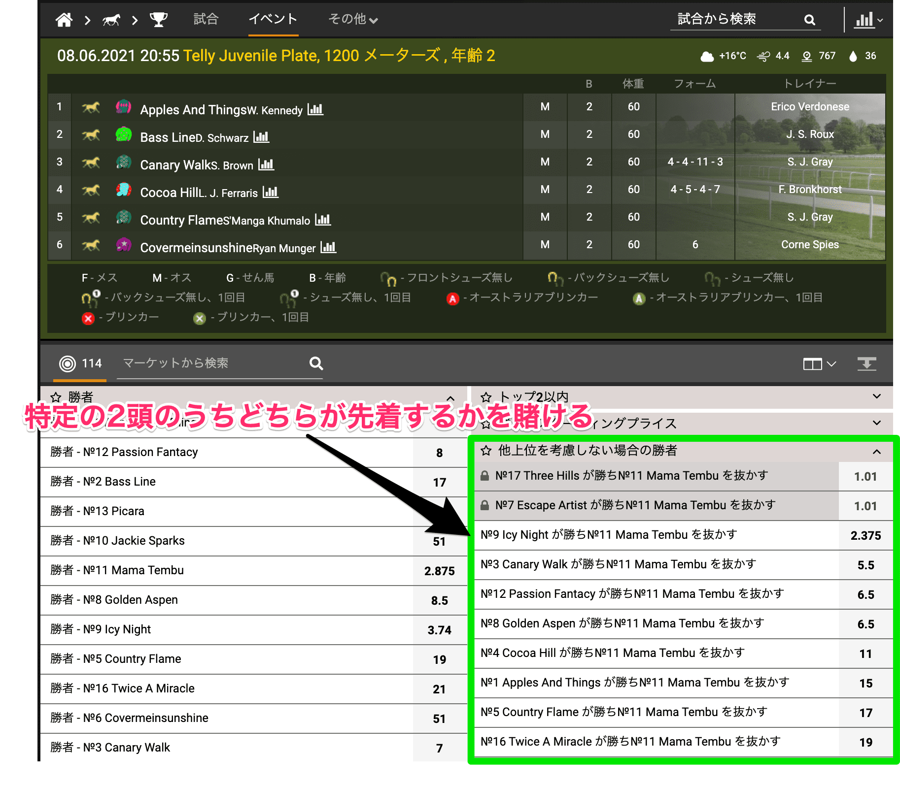 また、単勝や三連単などの一般的な買い方だけではなく、「特定の2頭のどちらが先着するか」という賭け方もあります。