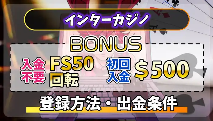 インターカジノのフリースピン50回転入金不要ボーナス(新規登録ボーナス)と500ドル初回キャッシュバック(入金ボーナス)を徹底解説。インターカジノのボーナス情報がひと目でわかります。