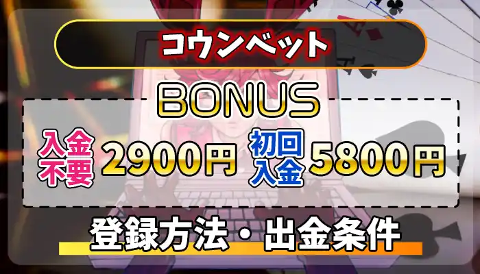 コウンベットの入金不要ボーナスを紹介!コウンベットでは、新規登録者に【2900円】入金不要ボーナスを提供しています。新規登録後、銀行口座を登録してサポートに連絡すれば受け取れます!