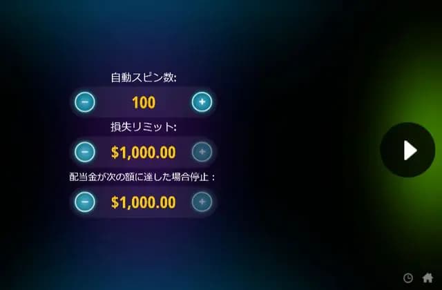 | オートプレイ | 5・10・15・20・25・50・75・100 200・300・400 ・500・750・1,000 |