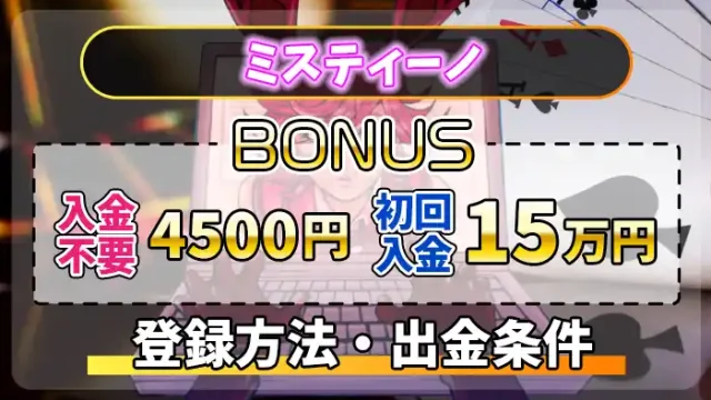 ミスティーノでは、下記ボタンから新規アカウント登録するだけで、自動的に4500円の現金ボーナスを獲得できます。