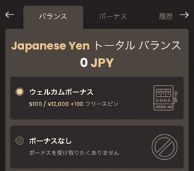 すると入金画面に遷移し、まずは有効なボーナスがある場合にはボーナスの受け取り可否を求められます。