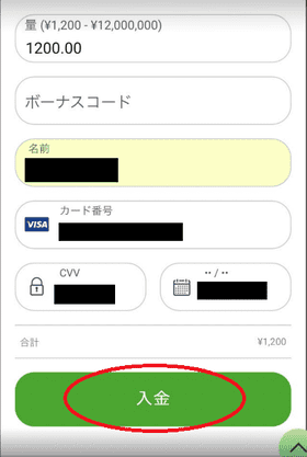 すべて正しく入力できたら「入金」という緑色のボタンをタップしてください。