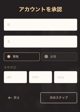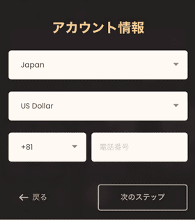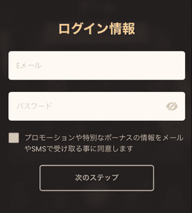 上記2点が入力できたら「プロモーションや特別なボーナスの情報をメールやSMSで受け取る事に同意します」のチェックは任意で、「次のステップ」をタップしてください。