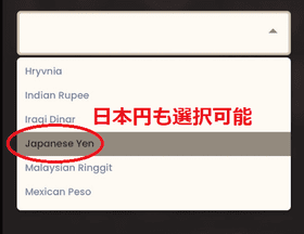 選択肢は非常に多くありますが、ちょうど中ほどに「Japanese Yen」があるので、日本人ユーザーは日本円に設定しておくのがおすすめです。