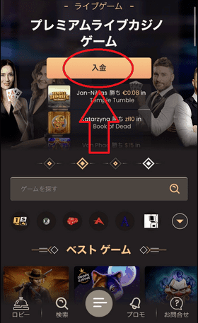 ナショナルカジノのアカウントにログインできたら、画面中央当たりに表示される「入金」というボタンをタップしてください。