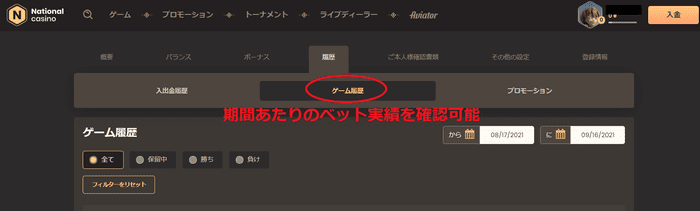 マイアカウントの「ゲーム履歴」のページも上手く活用しながら、必ず最低条件以上のベットを行うことを心がけましょう。