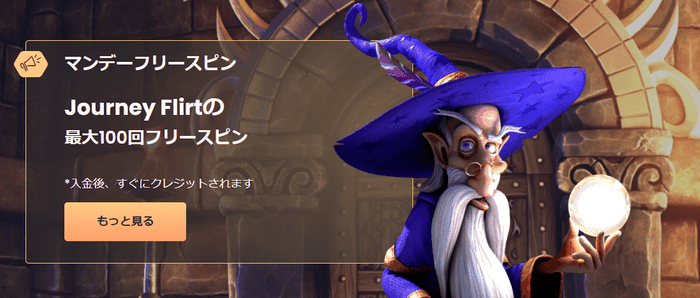 月曜日に「SPINME」というボーナスコードを入力して入金すると、入金額に応じた回数でフリースピンを獲得できます。