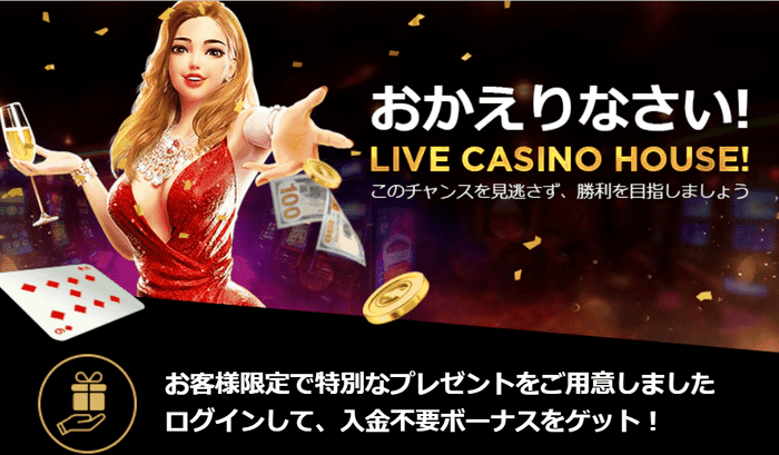 最も豪華な入金不要ボーナスが貰えるオンラインカジノと言えば、間違いなくライブカジノハウスです。