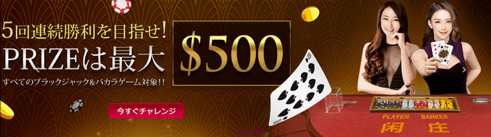 ライブバカラもしくはライブブラックジャックにおいて5連勝すると、5連勝目のベット額の5倍分の賞金を最大500ドルまで受け取れるという内容です。