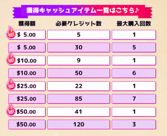 入金後すぐに進呈されるわけではなく、ベットを通じて「クレジット」というコンプポイントを貯めることで、総額500ドル分のキャッシュと交換できます。
