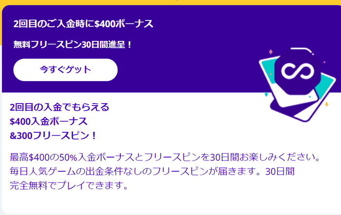 カスモでは2回目入金時に最大400ドルの50%ボーナスに加えて、300回分のフリースピンが獲得できます。