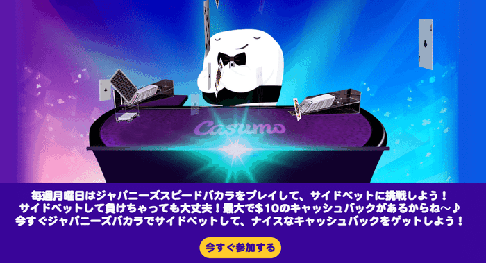 月曜日はEvolution Gamingの『Japanese Bacarrat』でサイドベットを行い、負けてしまった場合は最大で10ドルまで出金条件なしのキャッシュバックを獲得可能です。
