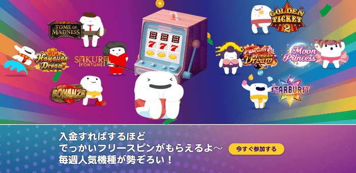 週ごとに異なる対象機種において、入金額に応じて出金条件なしのフリースピンを獲得できます。