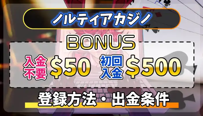 ノルティアカジノの入金不要ボーナスが貰える登録方法や出金条件、初回入金ボーナス情報について解説します。ノルティアカジノでは新規登録者に50ドルの入金不要ボーナスをプレゼントしています。