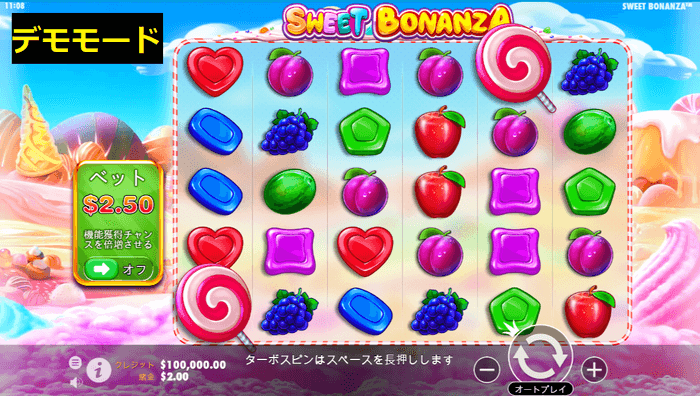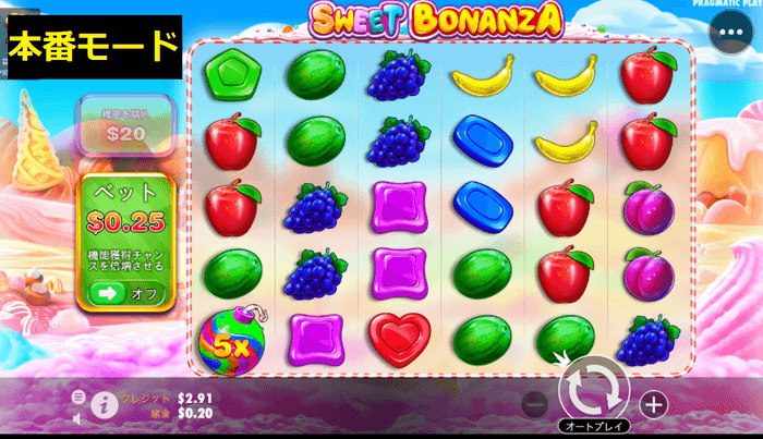 例えば、ベラジョンカジノでPragmaticPlayの『Sweet Bonanza』をプレイする場合、本番モードとデモモードを比較してみましょう。