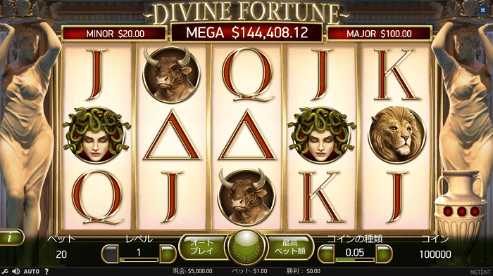 Divine Fortuneは、カジ旅でプレイしていた日本人プレイヤーが20円相当のベットで1400万円以上のジャックポットを獲得したという、非常に夢のある機種です。