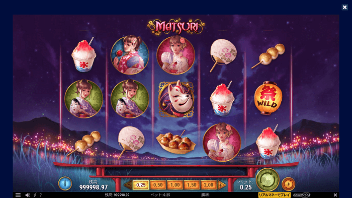 Play’N GOのMatsuriは、その名の通り日本の夏祭りをモチーフにしたオンラインスロットです。かき氷やたこやき、うちわなど祭にちなんだシンボルが特徴的です。