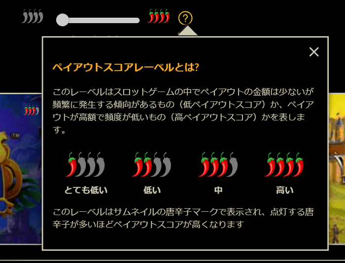 ユーログランドカジノには唐辛子の個数からボラティリティ順にスロットを検索できるというなかなか面白いシステムがあります。