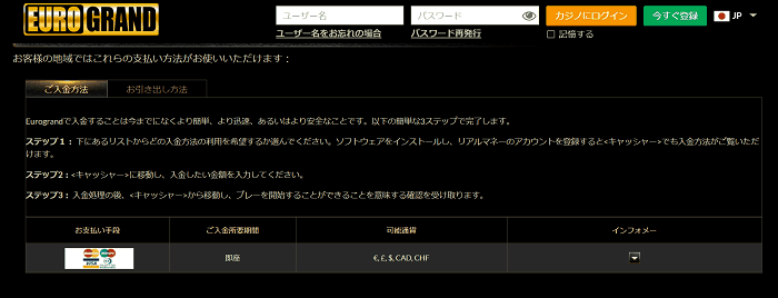 日本に居住しているユーザーがユーログランドカジノに入金するにはVISA、Mastercard、Dinners Clubのいずれかのクレジットカードが必要です。また出金にはエコペイズを利用できます。