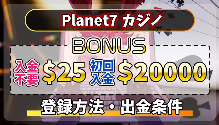 Planet7カジノ(プラネット7カジノ)の入金不要ボーナスについて解説します。当サイトのリンクからPlanet7カジノ(プラネット7カジノ)に新規登録すると25ドルの入金不要ボーナスが貰えます。